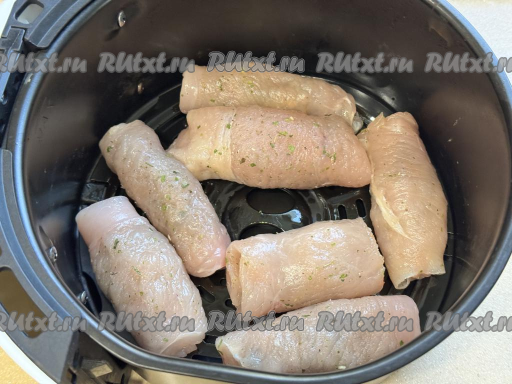 Выложить куриные рулетики с грибами на решётку аэрогриля в один слой. Установить чашу в аэрогриль.