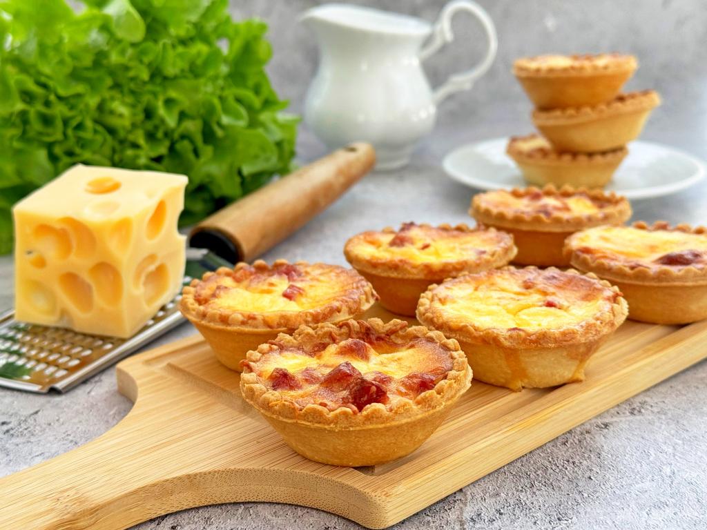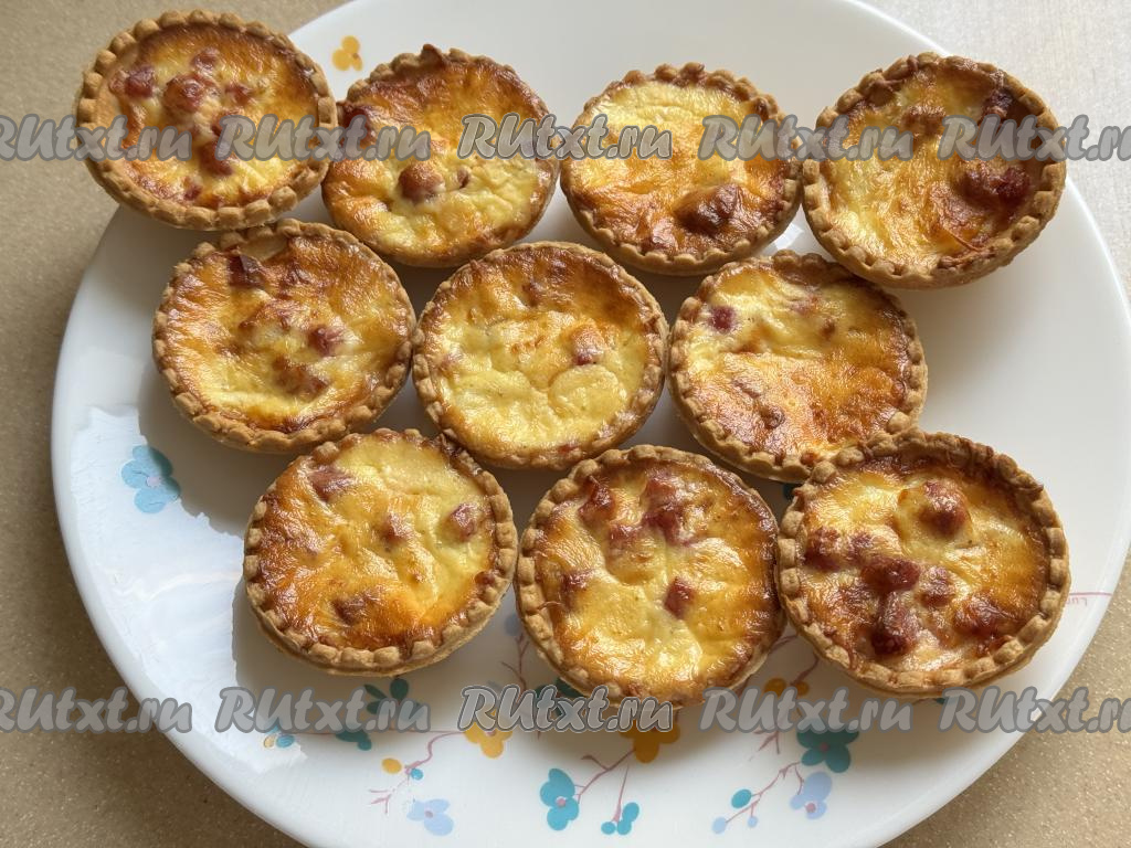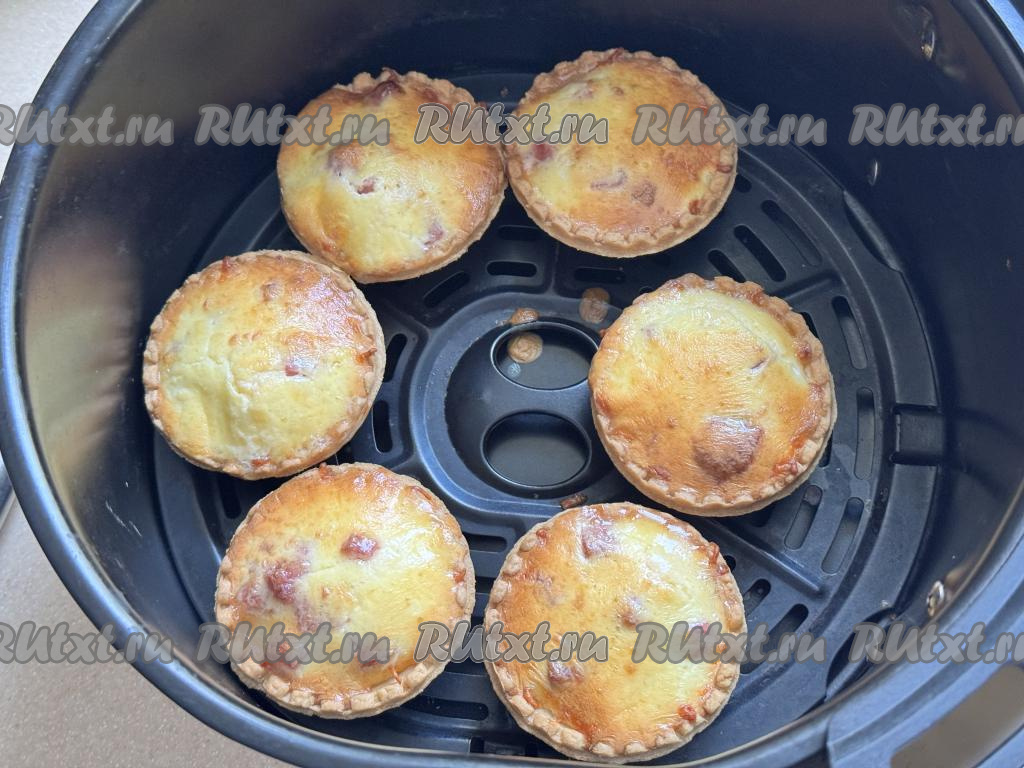 Готовые тарталетки достать из аэрогриля. Запечь оставшиеся 4 тарталетки в аэрогриле, не забывая полить их сверху заливкой.