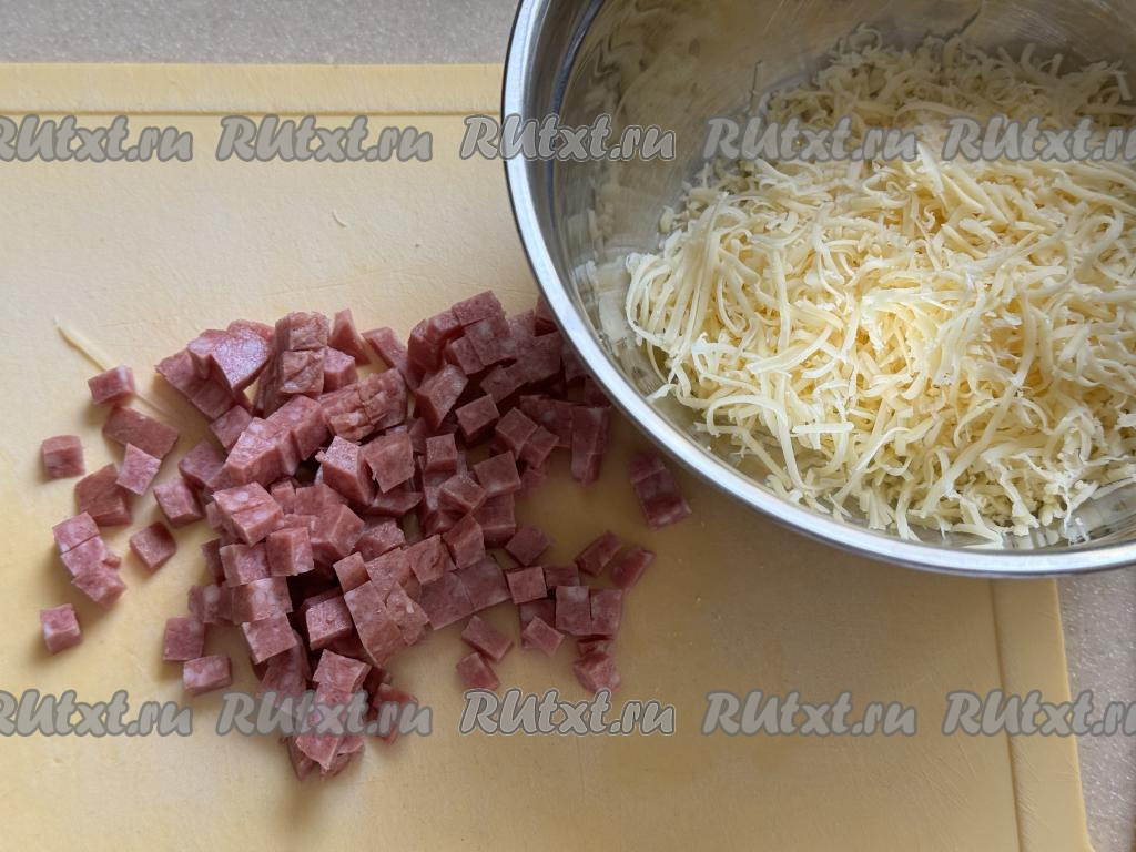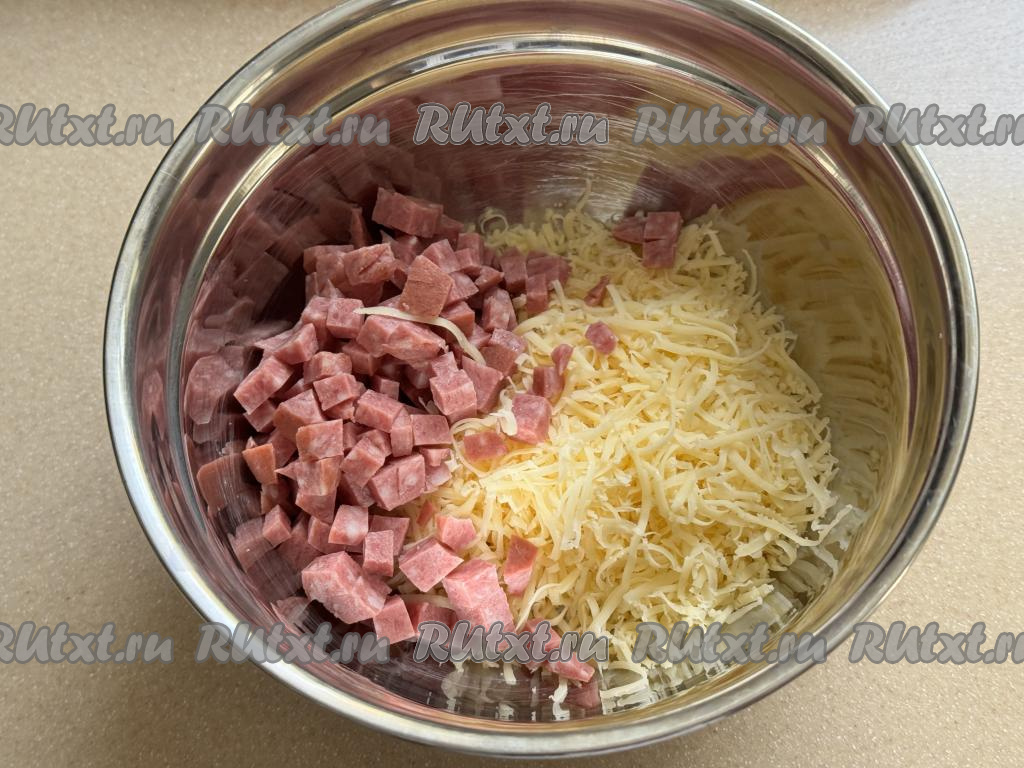В миске соединить сыр и колбасу.