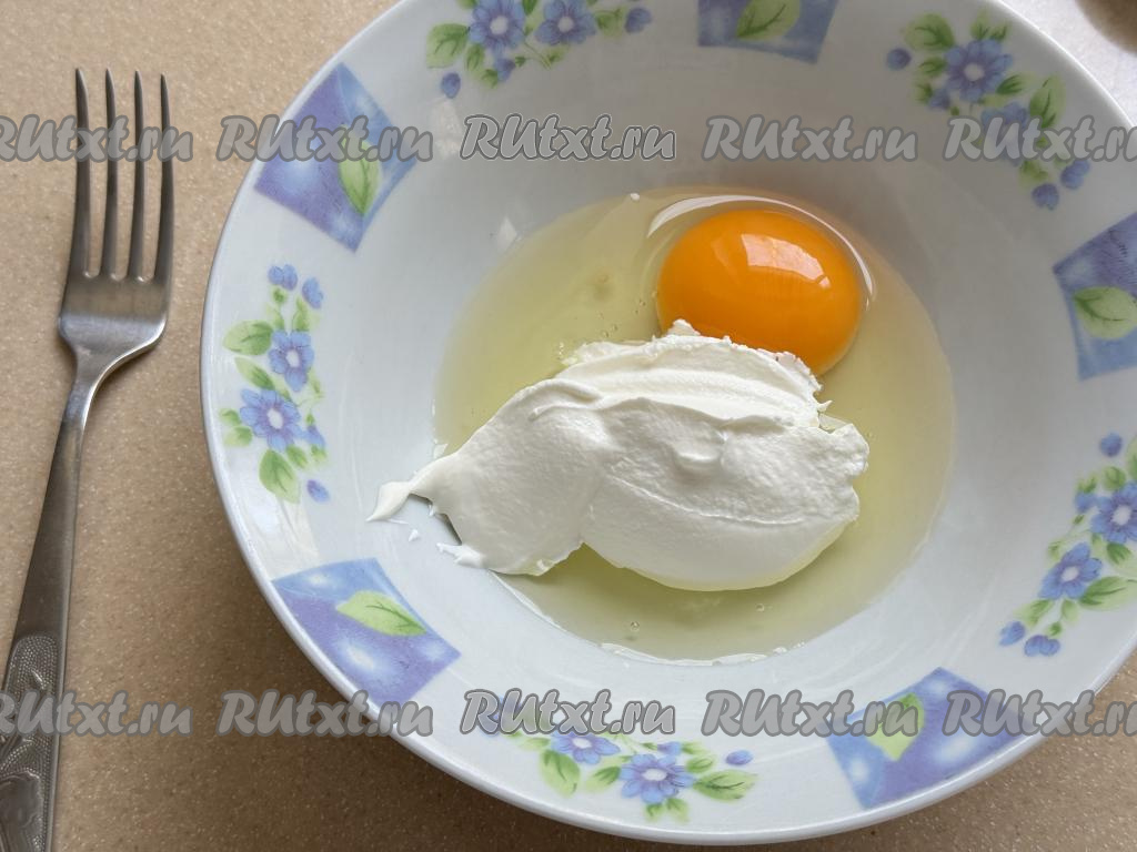 Для приготовления заливки в глубокой тарелке нужно соединить сметану и сырое яйцо, перемешать вилкой.