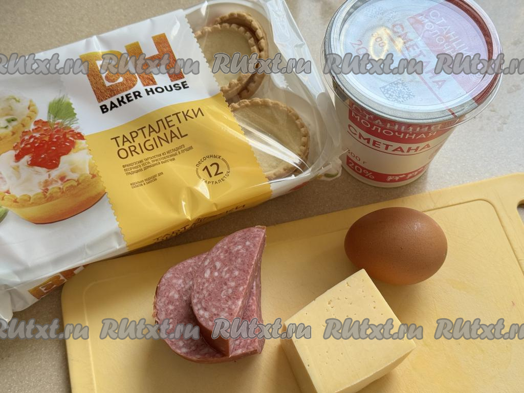 Подготовить продукты. Колбасу можно взять как варёную, так и копчёную или полукопчёную (у меня - полукопчёная). Сметана подойдёт любой жирности (я взяла жирностью 20%). Песочные тарталетки для этой закуски можно купить практически в любом продуктовой магазине.