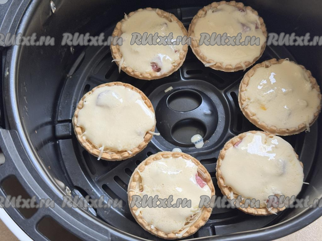 Аккуратно влить заливку в тарталетки, находящиеся в аэрогриле. Оставшуюся заливку непосредственно перед запеканием нужно будет распределить по 4 тарталеткам, которые не поместились в чашу аэрогриля.