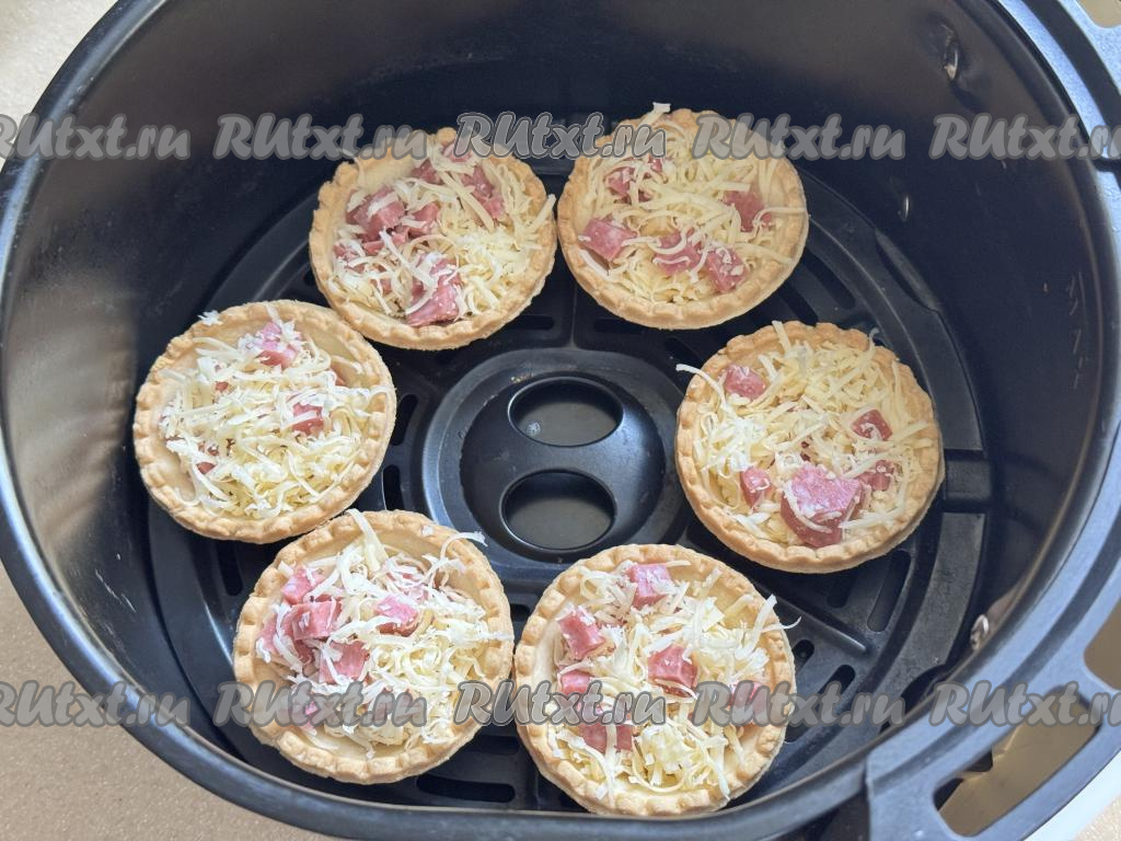 Разложить колбасно-сырную начинку по тарталеткам, заполняя их практически полностью. Я разложила по 10 тарталеткам. Поставить тарталетки на решётку в чашу аэрогриля в один слой. У меня поместились в чашу 6 тарталеток.