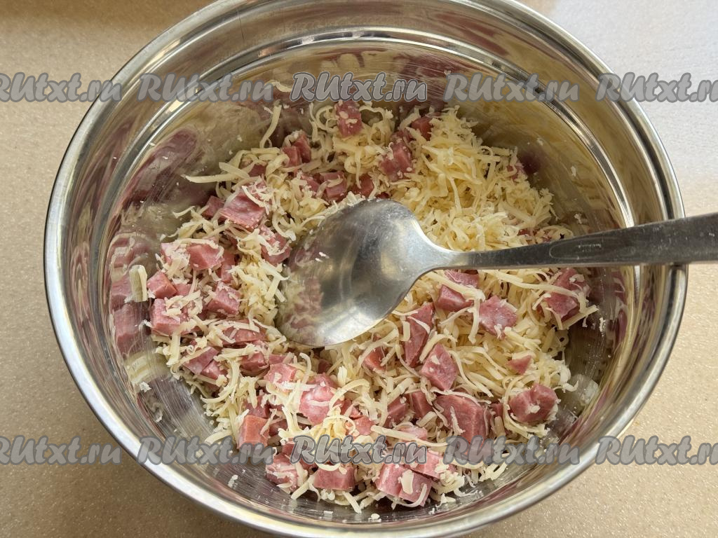 Перемешать начинку из сыра и колбасы.