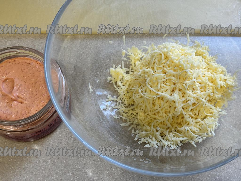 Сыр натереть на мелкой тёрке в глубокую миску.