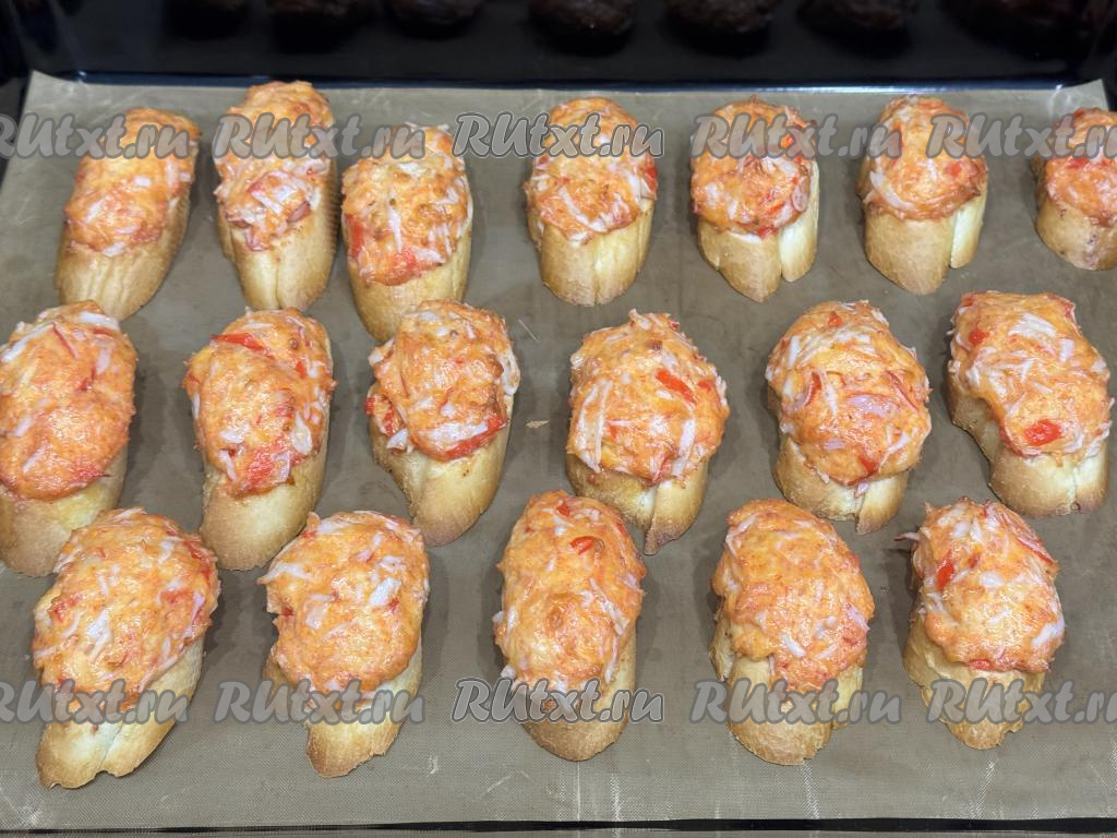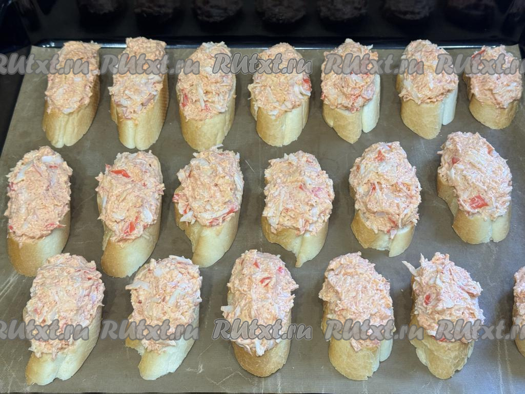 Противень застелить силиконовым ковриком (или пергаментом). Выложить кусочки багета на противень. Поверх багета чайной ложкой разложить крабово-сырную массу, формируя бутерброды.