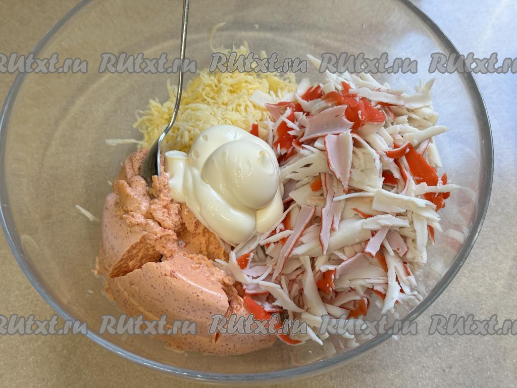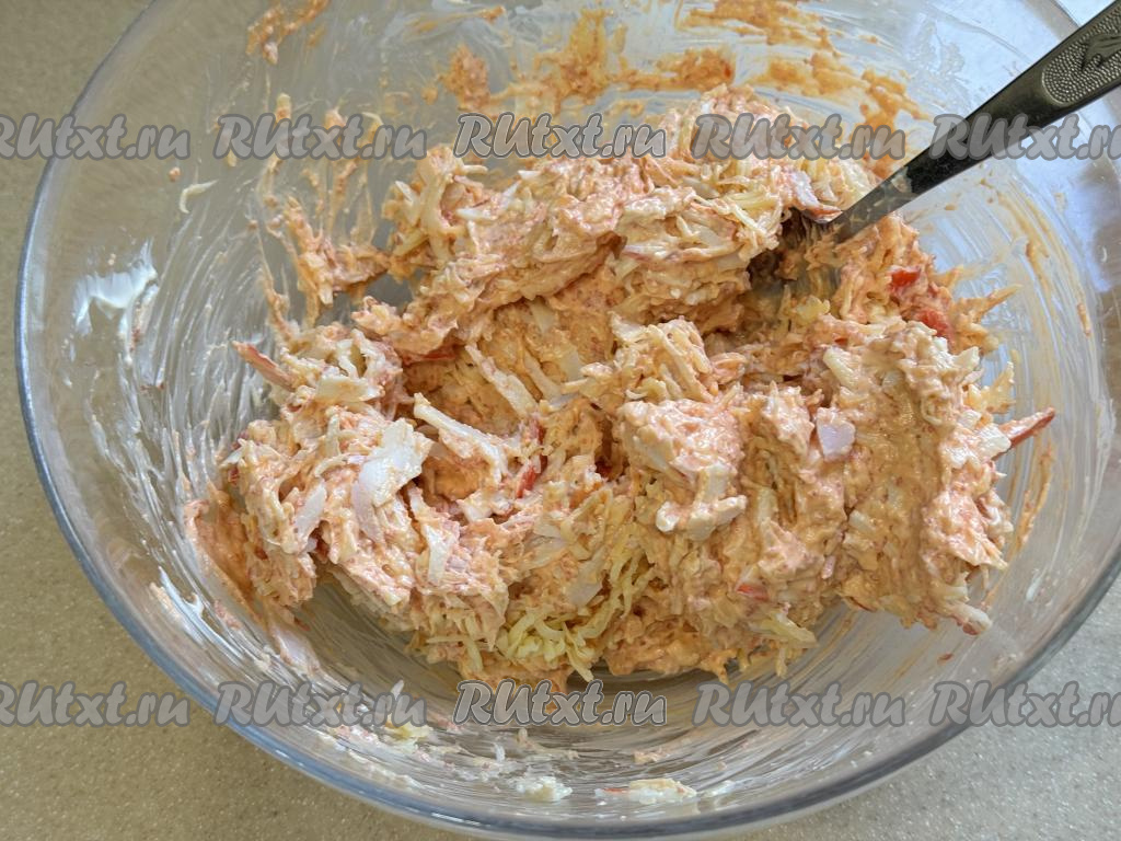 Перемешать содержимое миски до однородности и крабово-сырная масса для формирования бутербродов готова.Шаг 5 из 8: