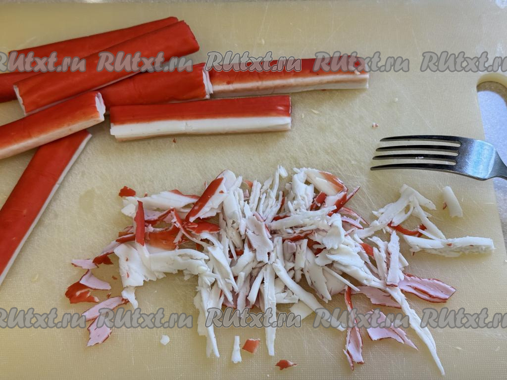 Крабовые палочки очистить от упаковки и с помощью вилки разорвать на волокна (или просто мелко нарезать).