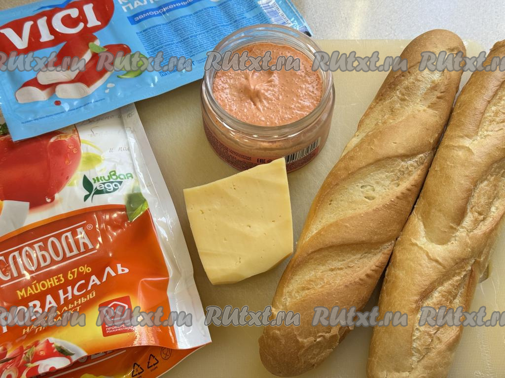 Подготовить продукты. В этот раз для формирования ленивых суши я взяла 2 мини-багета, но можно использовать и 1 длинный багет. Подкопчённую рыбную икру можно взять любую. Крабовые палочки, если они заморожены, нужно полностью разморозить.