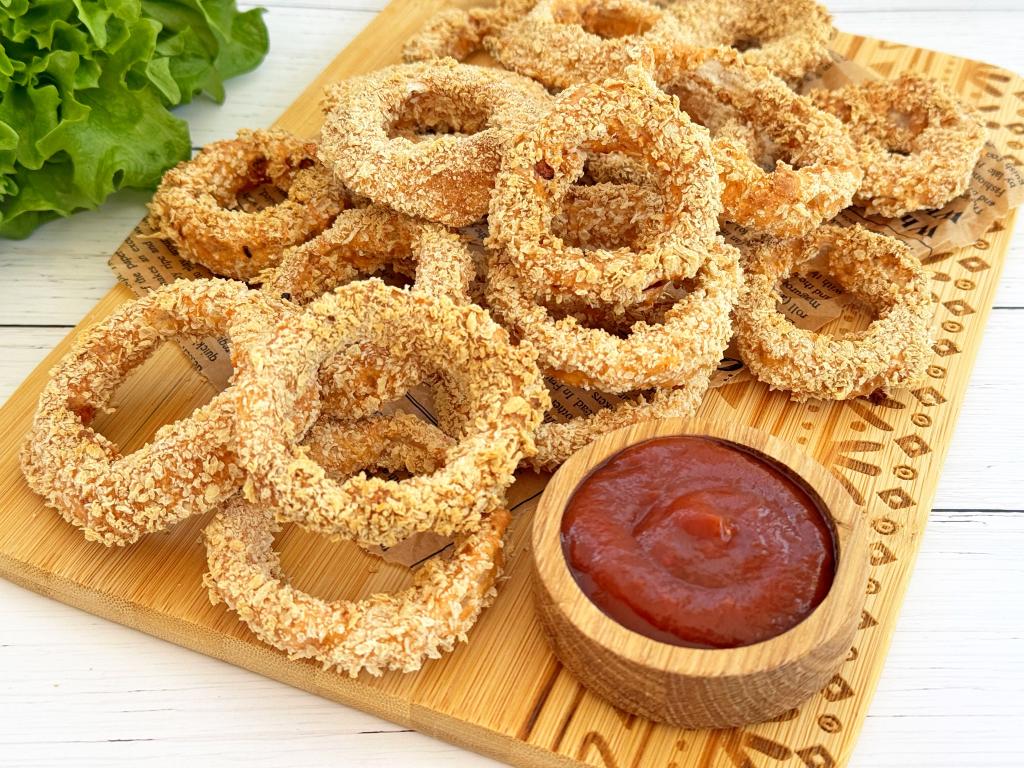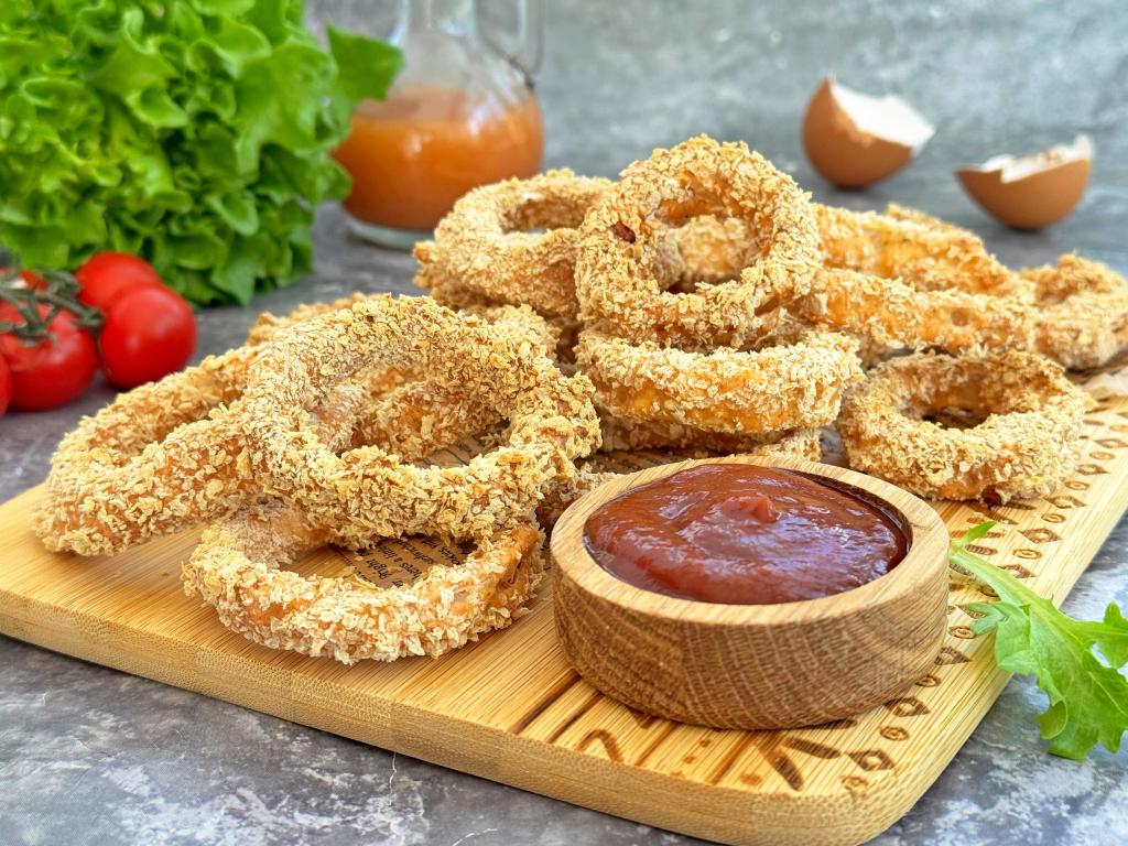 Готовые аппетитные, вкусные, приятно похрустывающие луковые кольца в кляре подать к столу с любимым соусом.