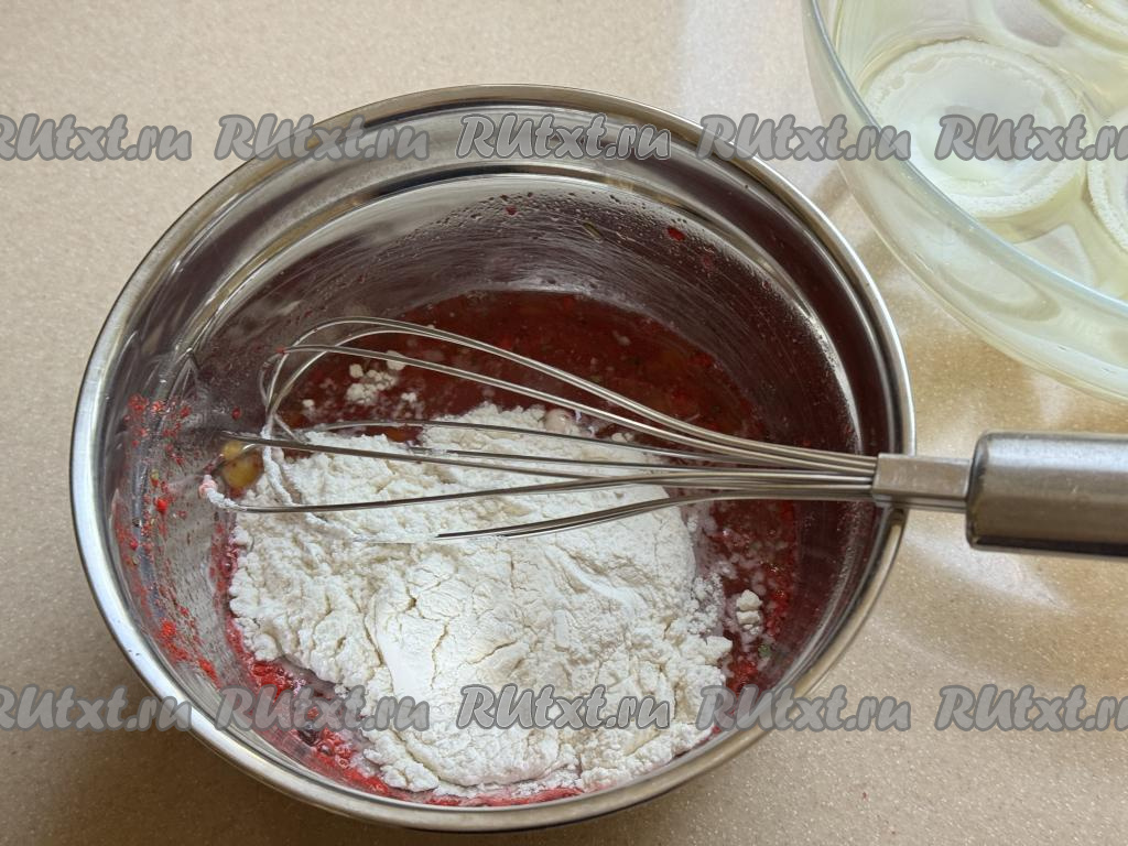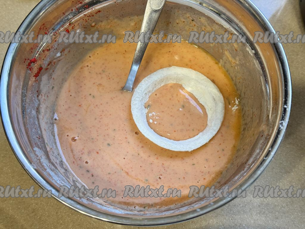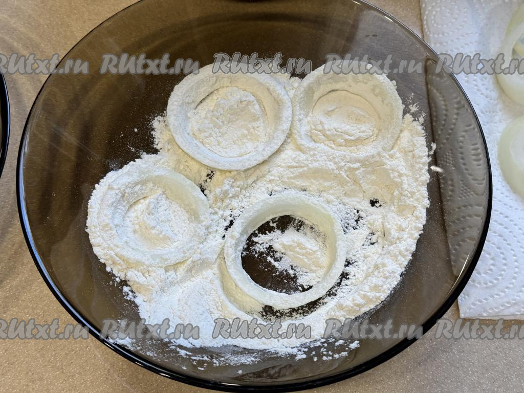 Затем каждое луковое кольцо, покрытое мукой, окунуть полностью в кляр.