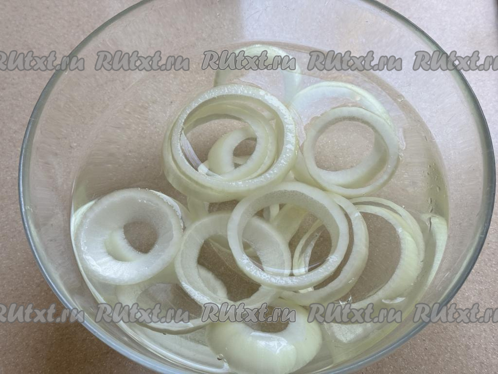 Лук очистить и нарезать на кольца толщиной примерно 5-7 миллиметров. Разделить аккуратно нарезанный лук на отдельные колечки и поместить в ледяную воду на минут 15.