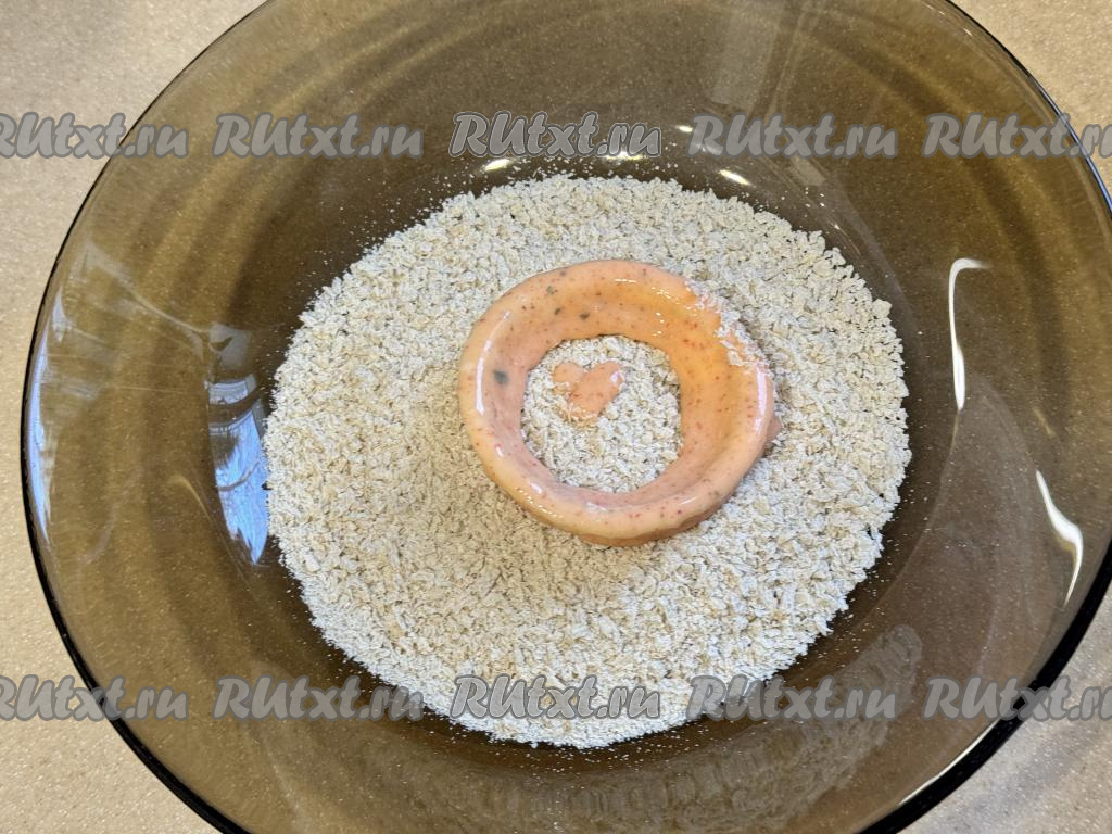 После этого кольца, покрытые кляром, обвалять с двух сторон в панировочных сухарях.