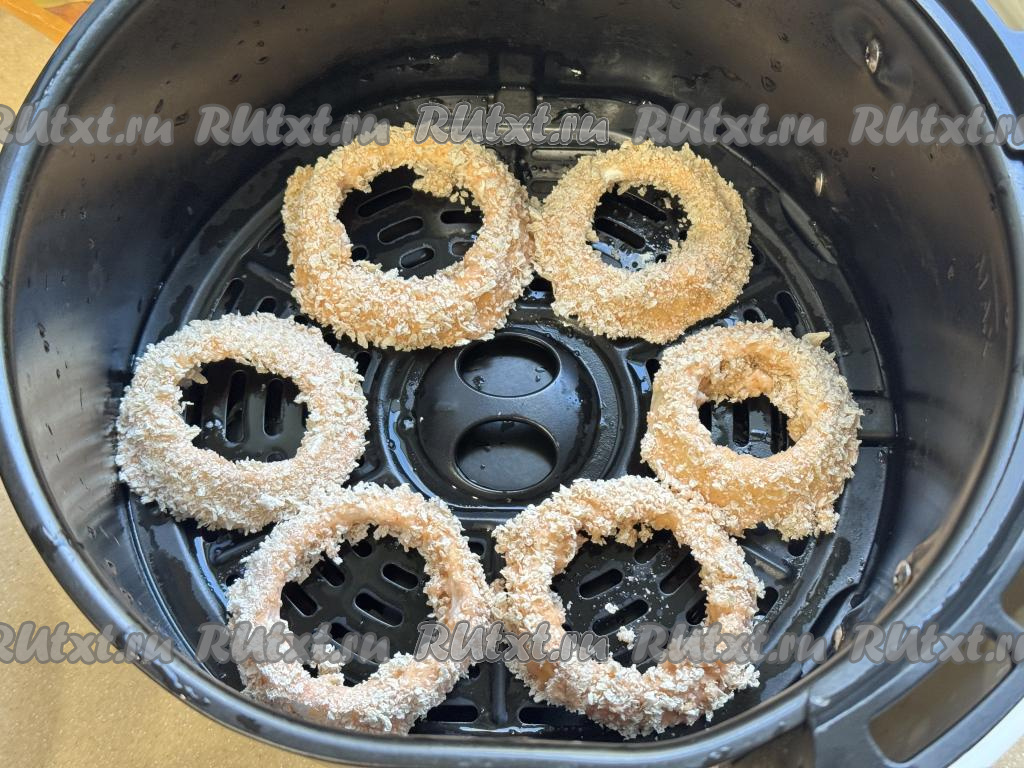 Готовые луковые кольца, покрытые хрустящим кляром, переложить из чаши аэрогриля на тарелку. Постепенно покрыть кляром и запечь все кольца. За один раз все колечки в чашу аэрогриля не помещаются, поэтому запекать их нужно в несколько заходов.