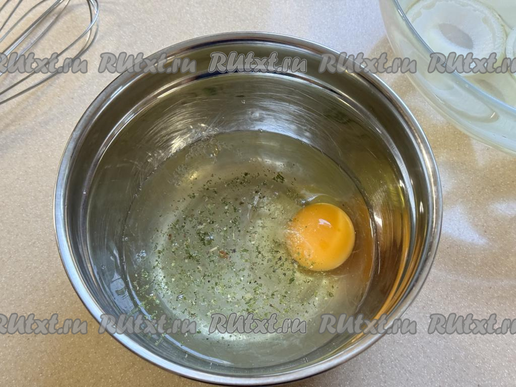 Пока луковые кольца замачиваются в воде, можно приготовить кляр. Для этого в миску нужно вбить сырое яйцо, влить 100 миллилитров воды, добавить немного соли (я использовала соль, смешанную с зеленью).