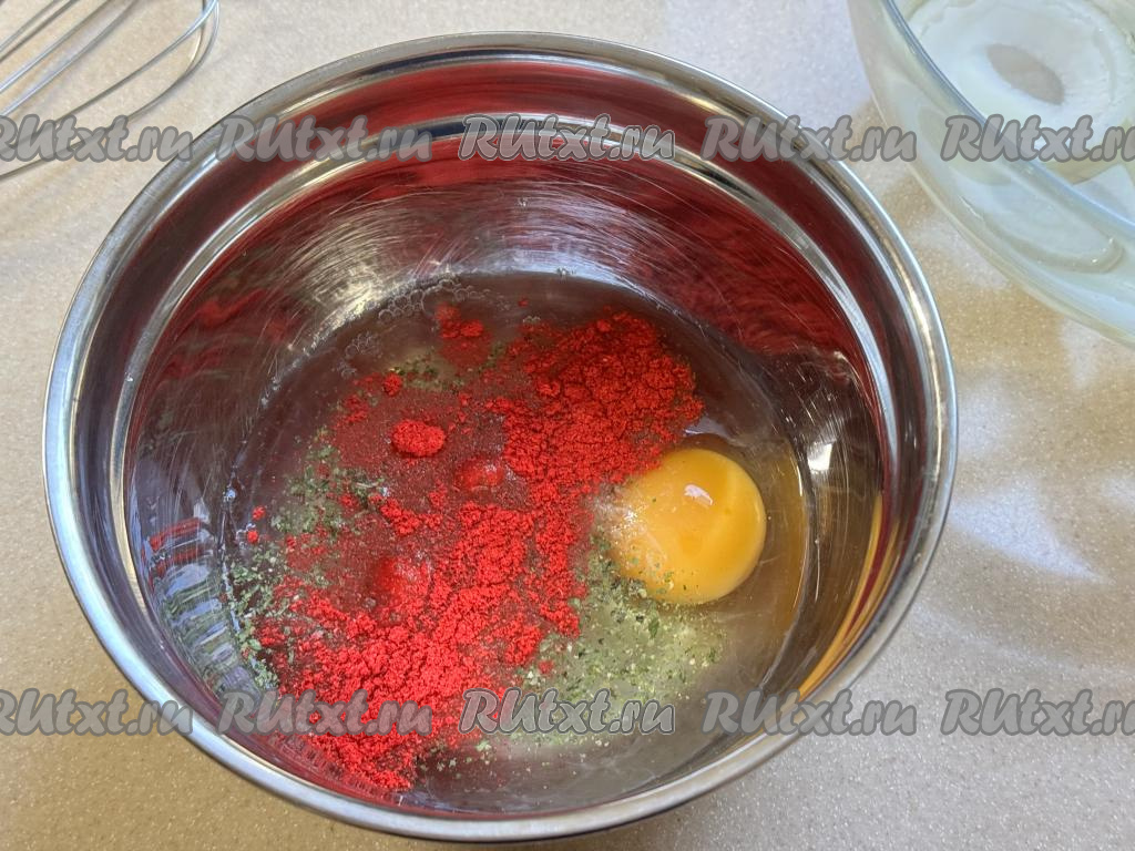 В миску с водой и яйцом всыпать любимые специи (я добавила 1 чайную ложку паприки).