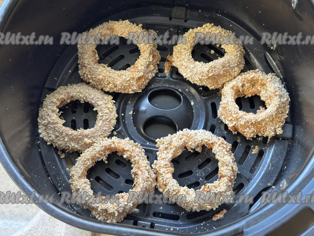 Луковые кольца, покрытые кляром и панировочными сухарями, выложить на решётку аэрогриля в один слой. Установить чашу в аэрогриль. Выставить температуру 200 градусов, время - 15 минут.