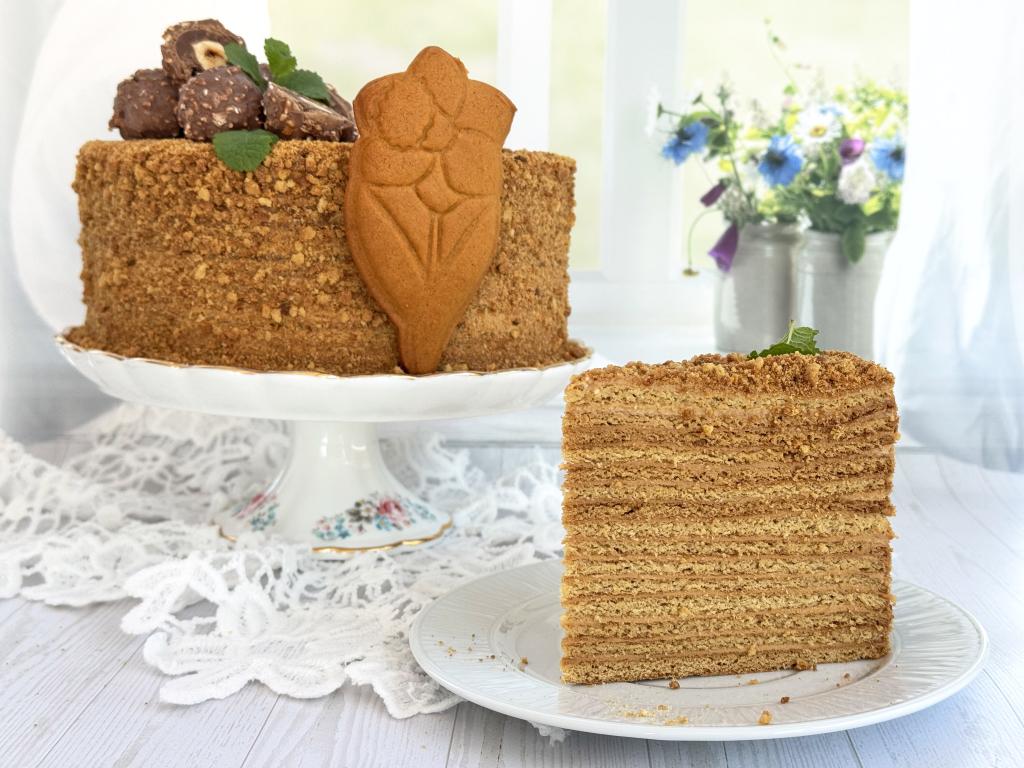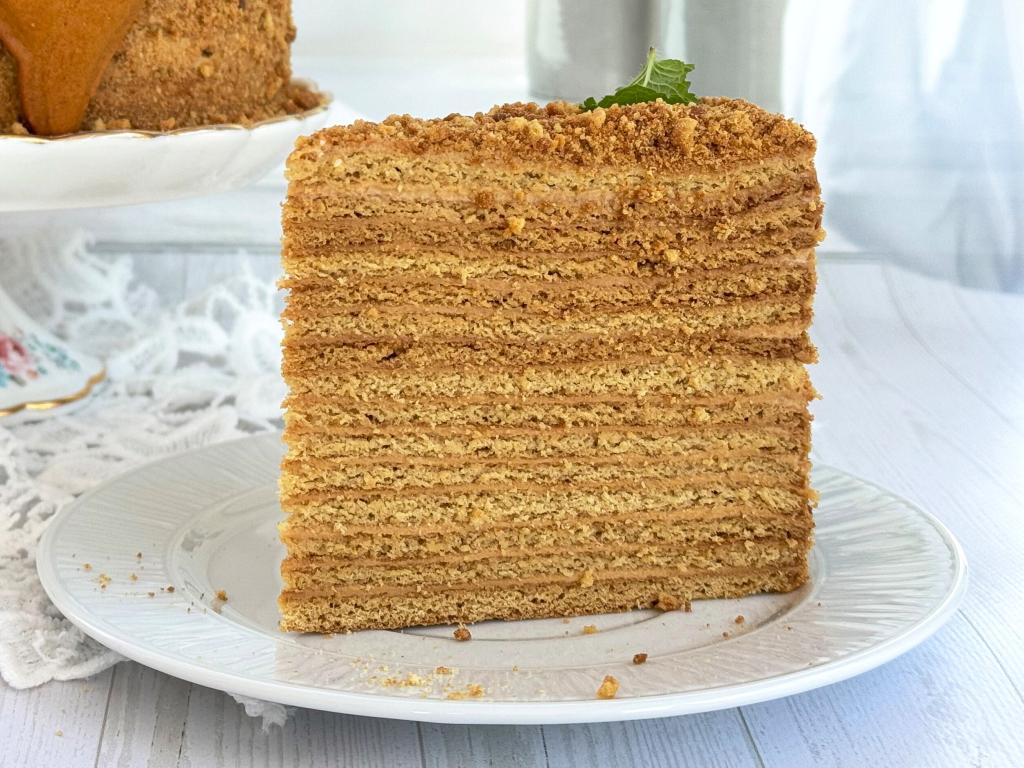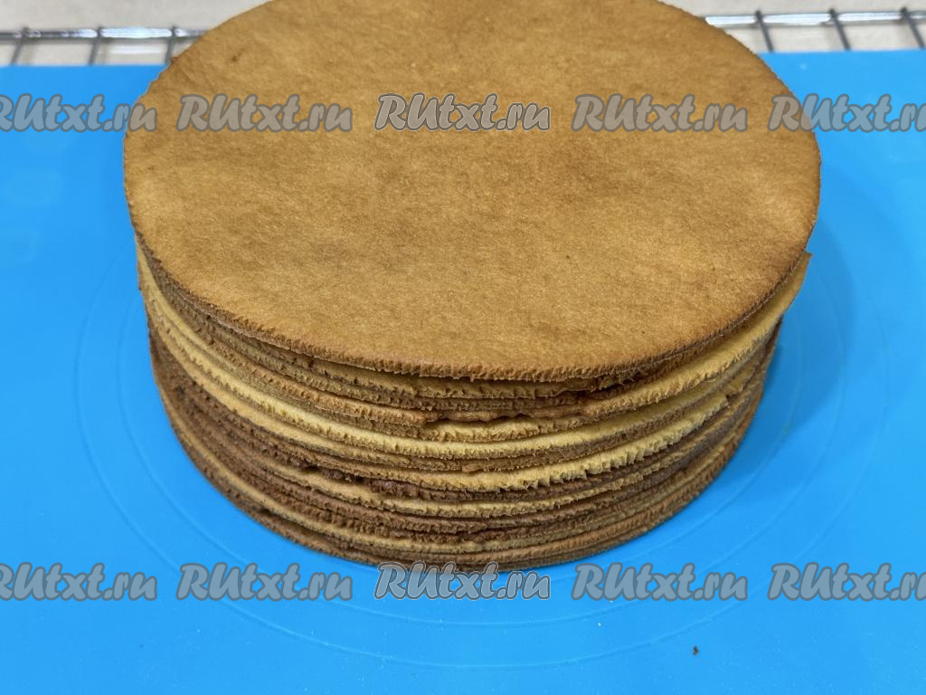 Таким образом собрать весь карамельный медовик, чередуя коржи с кремом. Верхний корж тоже смазать кремом.