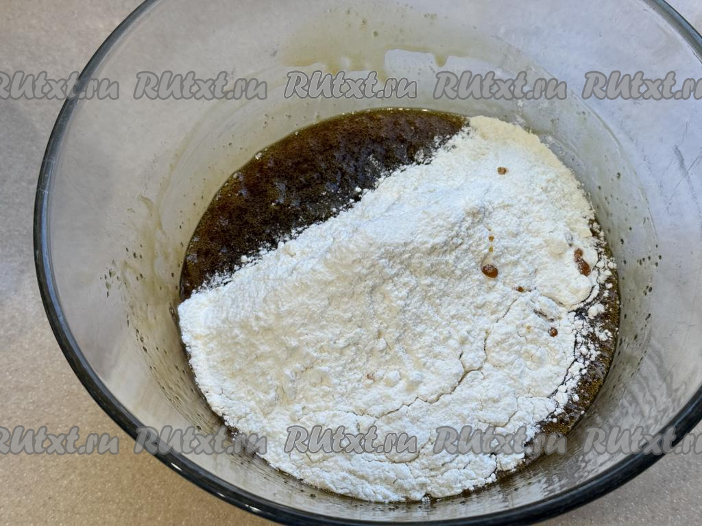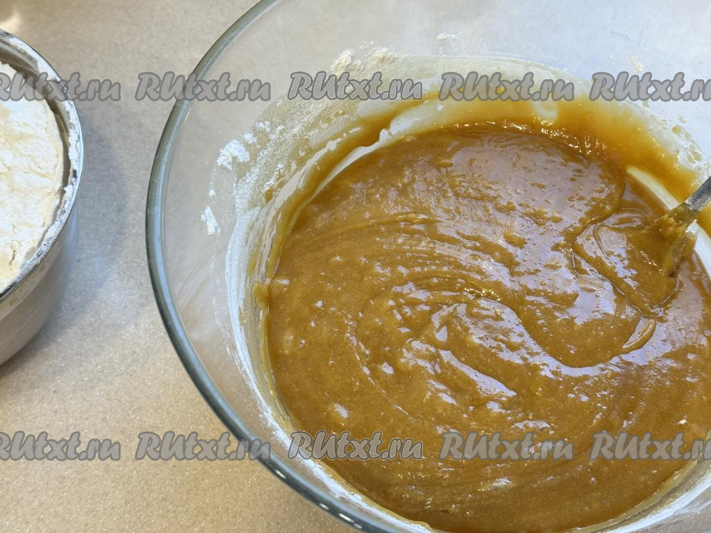 Перемешать карамельно-медовое тесто для торта столовой ложкой до однородности. Начать небольшими порциями добавлять оставшуюся муку. Вначале перемешивать тесто ложкой.
