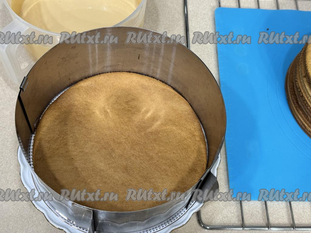 Теперь можно приступать к сборке карамельного медовика. Для этого на плоскую тарелку или плоскую основу выставить кулинарное кольцо. Выложить один корж, смазать его частью крема из сметаны и варёной сгущёнки, затем выложить следующий корж.