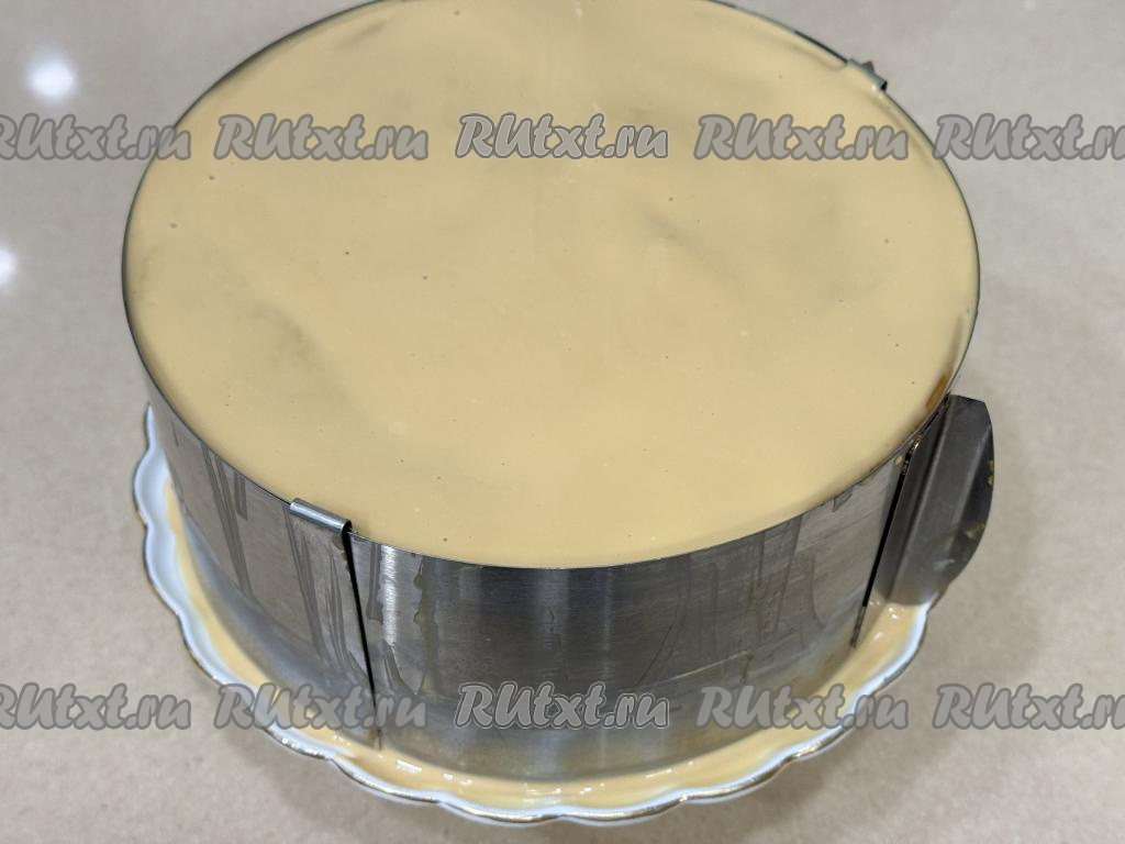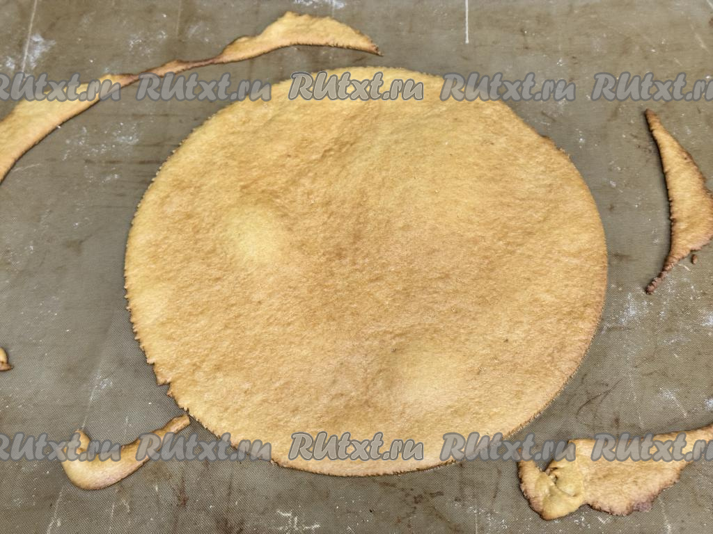 Отправить противень в духовку, разогретую до 180 градусов. Корж тонкий, на его выпечку потребуется всего 5 минут.