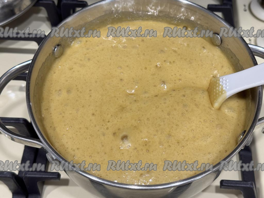 Поставить кастрюлю на средний огонь и, постоянно помешивая, довести массу до кипения.