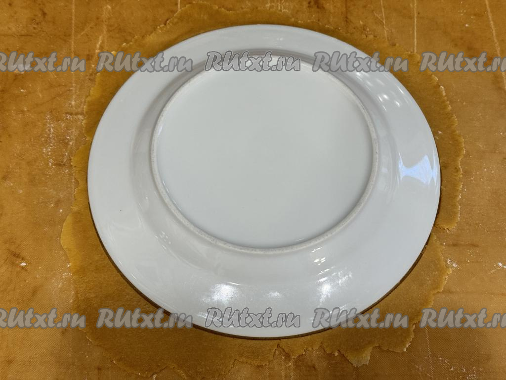 Каждую часть теста на тефлоновом коврике или на пергаменте, присыпая по мере надобности скалку мукой, раскатать в круг диаметром 19 сантиметров. Для того чтобы подравнять края круга, нужно поверх раскатанного теста выложить перевёрнутую тарелку диаметром 19 сантиметров. Тесто, выходящее за края тарелки, обрезать.