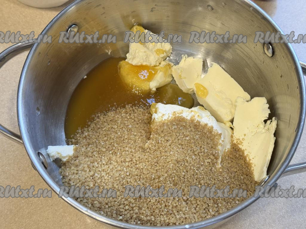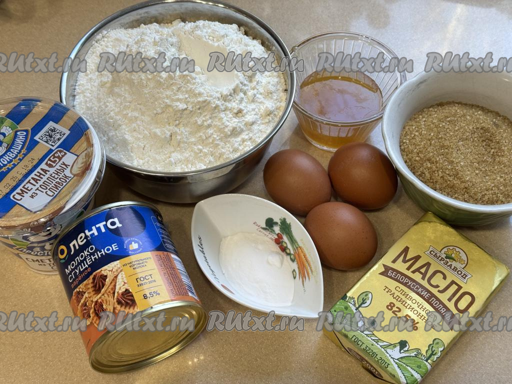 Подготовить продукты. Сахар я взяла тростниковый, но можно взять и обычный. Сливочное масло берите от проверенного производителя, жирностью не менее 82,5%. Сметана нужна жирностью не менее 15%. Мёд желательно брать жидкий, если у вас мёд засахарился, его можно прогреть на водяной бане или в течение 10-15 секунд в микроволновке.