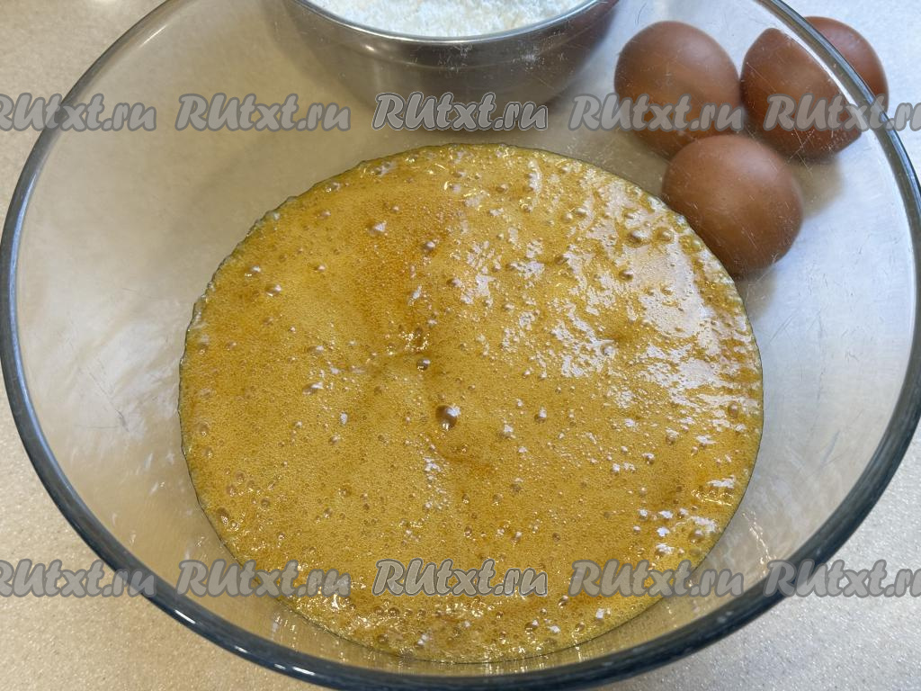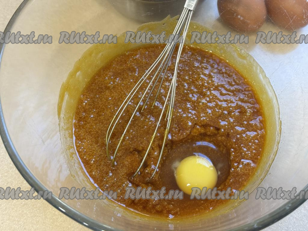 Затем добавлять в миску по одному сырому яйцу, каждый раз тщательно вмешивая венчиком. Только после получения однородной медово-яичной массы добавлять в миску следующее яйцо.