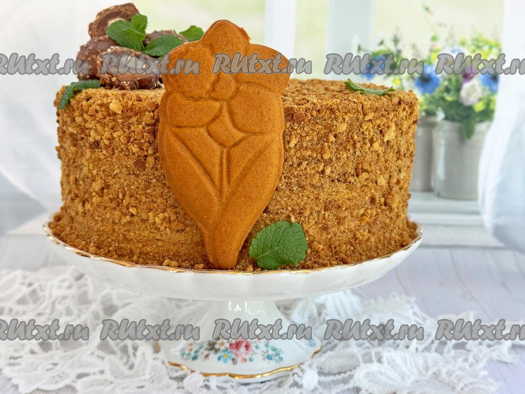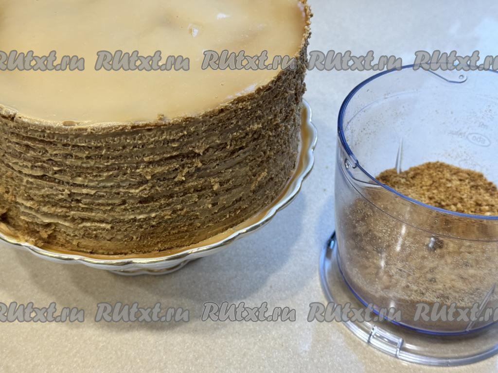 Не снимая кулинарное кольцо, поставить медовик в холодильник на ночь. На следующий день снять кулинарное кольцо с торта. Обрезки теста, которые оставляли для украшения, измельчить в крошку.