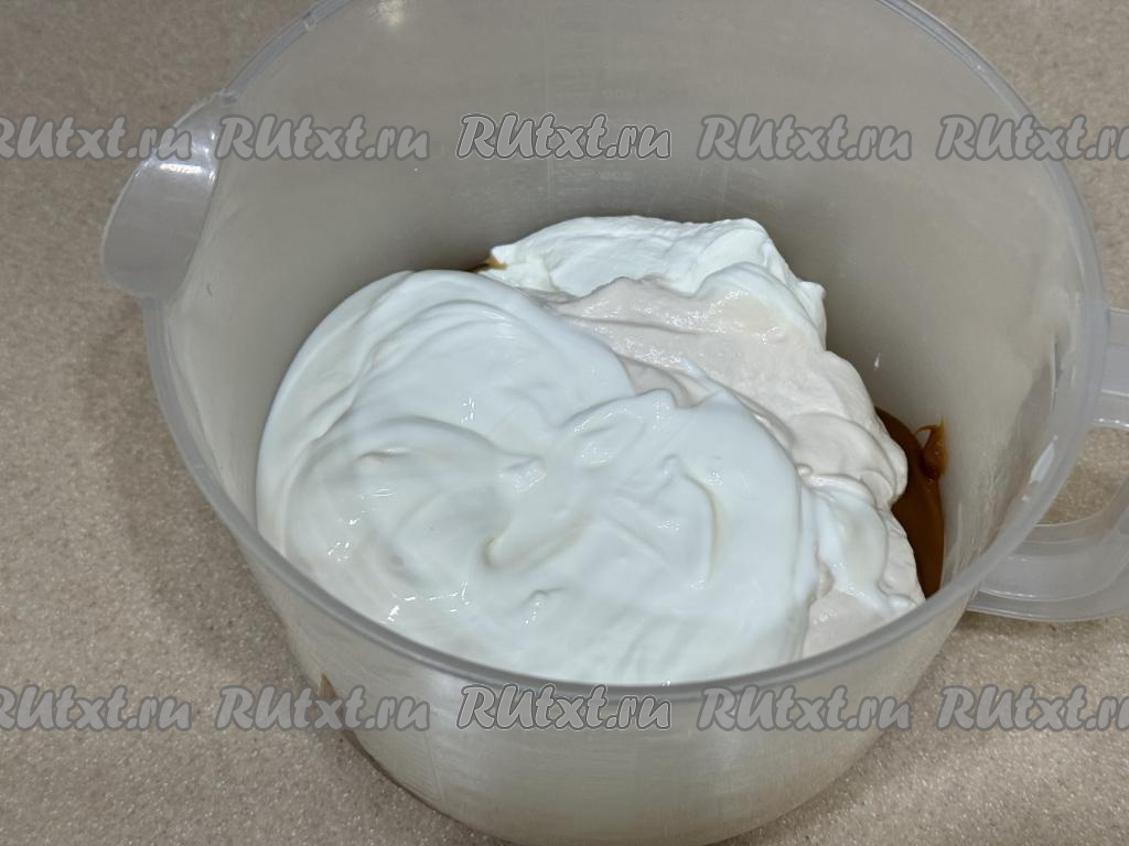 Для приготовления крема соединить сметану и варёную сгущёнку, перемешать крем венчиком до однородности. Крем получится негустым.