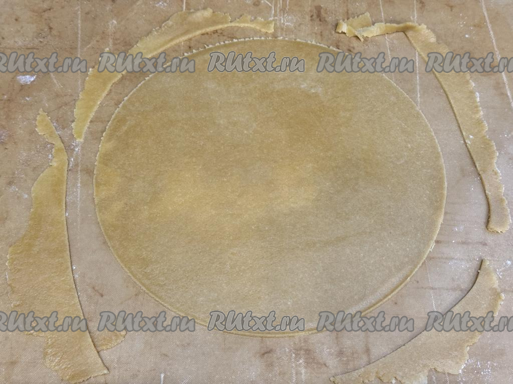 Коврик (или пергамент) вместе с кругом из теста и обрезами переложить на противень.