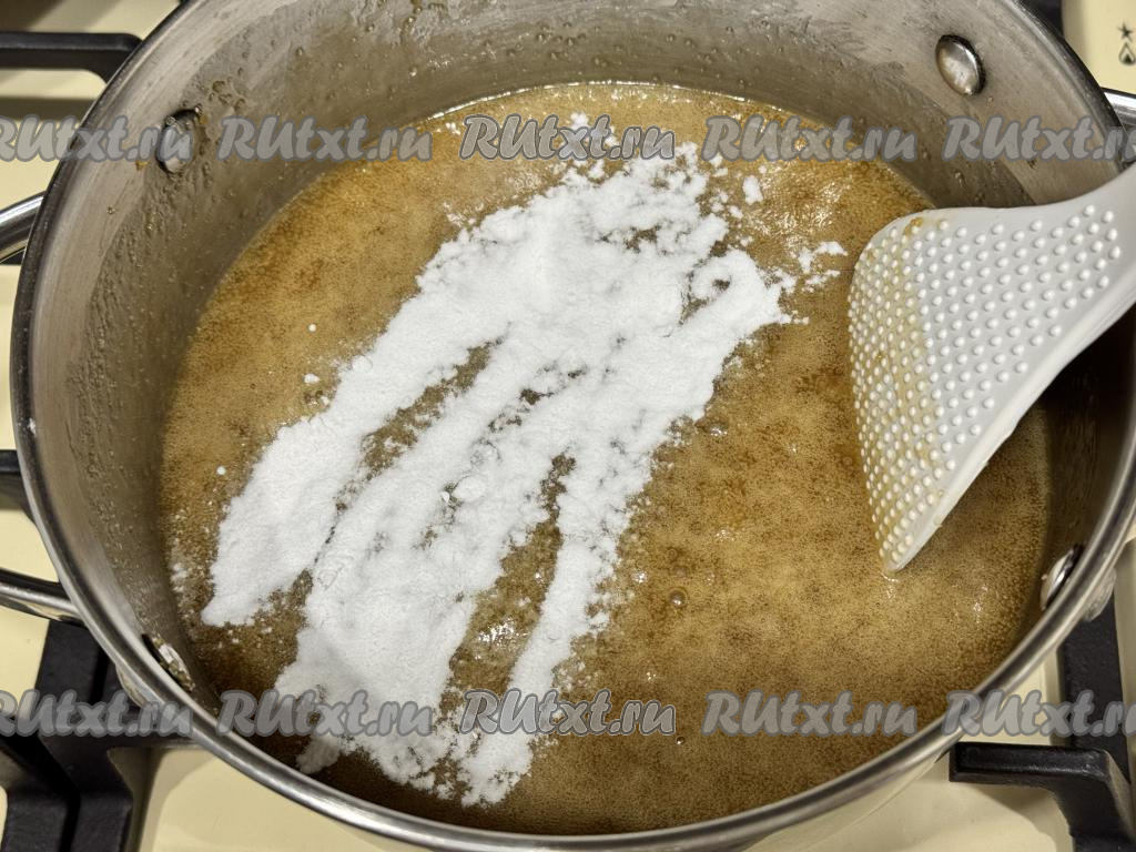 Как только карамель закипит, всыпать соду в кастрюлю.