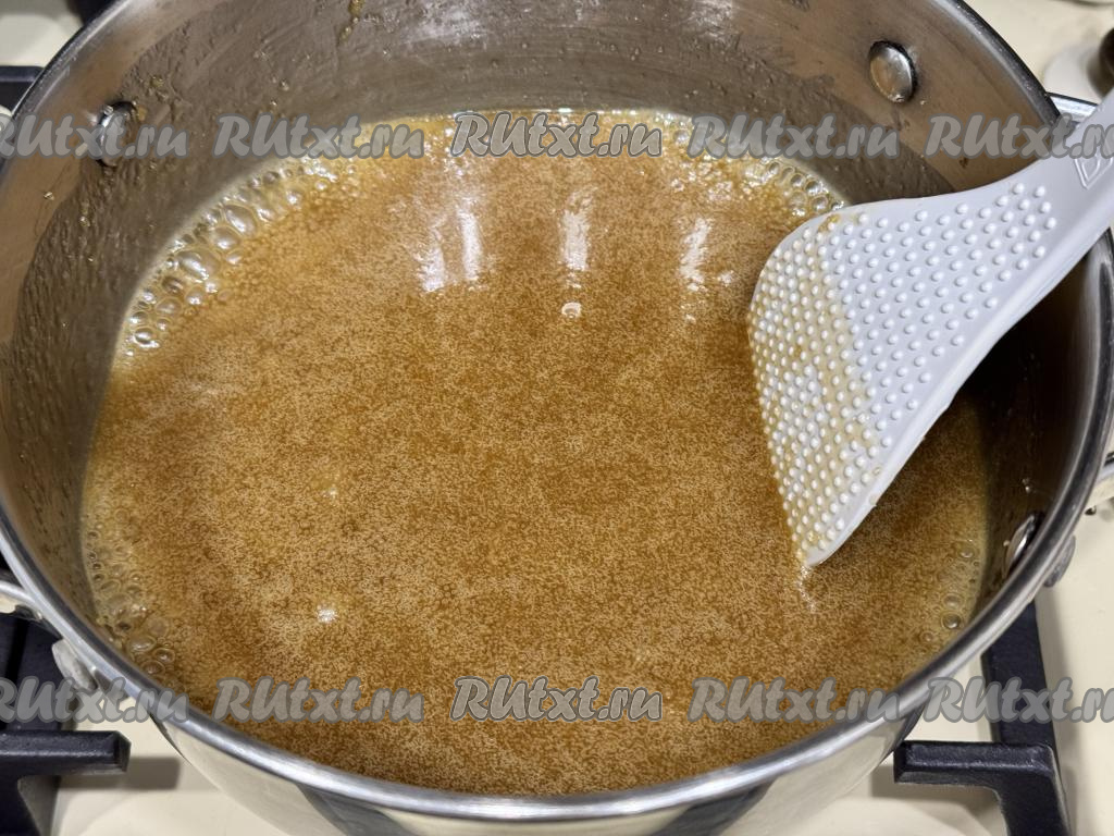 Перемешать медовую массу, она сильно увеличится в объёме. Томить на небольшом огне ещё минут 5, постоянно помешивая, масса станет карамельного цвета.