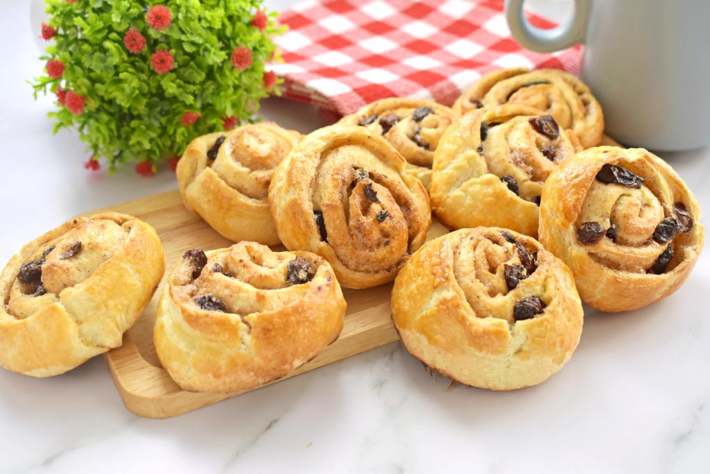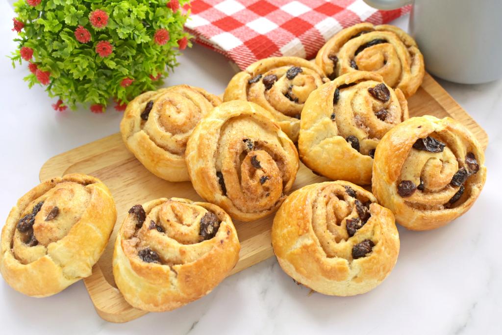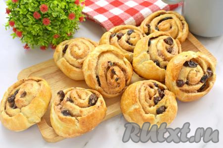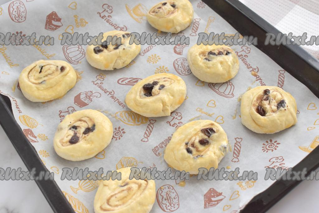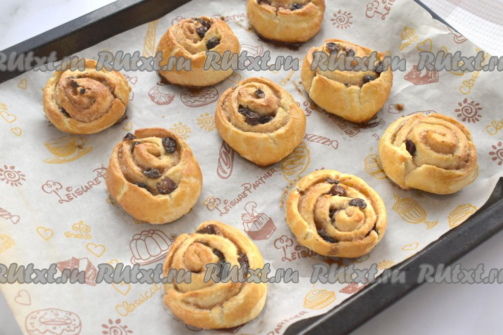 Отправляем противень с улитками с изюмом в разогретую до 180 градусов духовку, выпекаем 15-20 минут (до приятного подрумянивания слоёного теста).