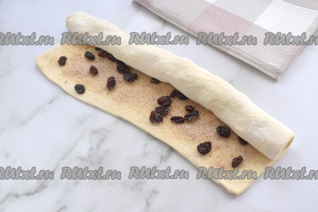 Начиная с более длинной стороны, сворачиваем тесто с изюмом в рулет.