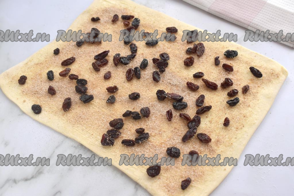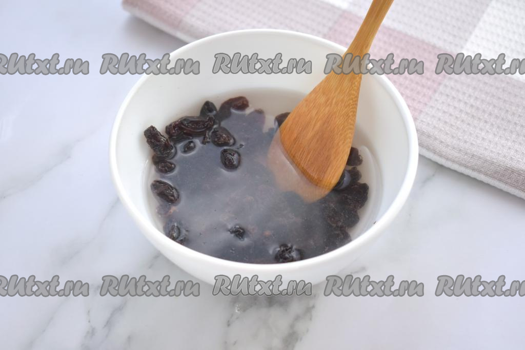 Достаём покупное слоёное тесто из морозилки (я купила дрожжевое слоёное тесто, но можно взять и бездрожжевое). Пока тесто размораживается, можно заняться изюмом. Промываем изюм проточной водой, выкладываем в миску, заливаем полностью кипятком, оставляем на 5-7 минут. Затем распарившийся изюм откидываем на сито, промываем проточной водой. Раскладываем изюм на бумажном (или тканевом) полотенце, даём обсохнуть. Осматриваем изюм, если есть остатки веточек, их нужно будет отделить от изюма.