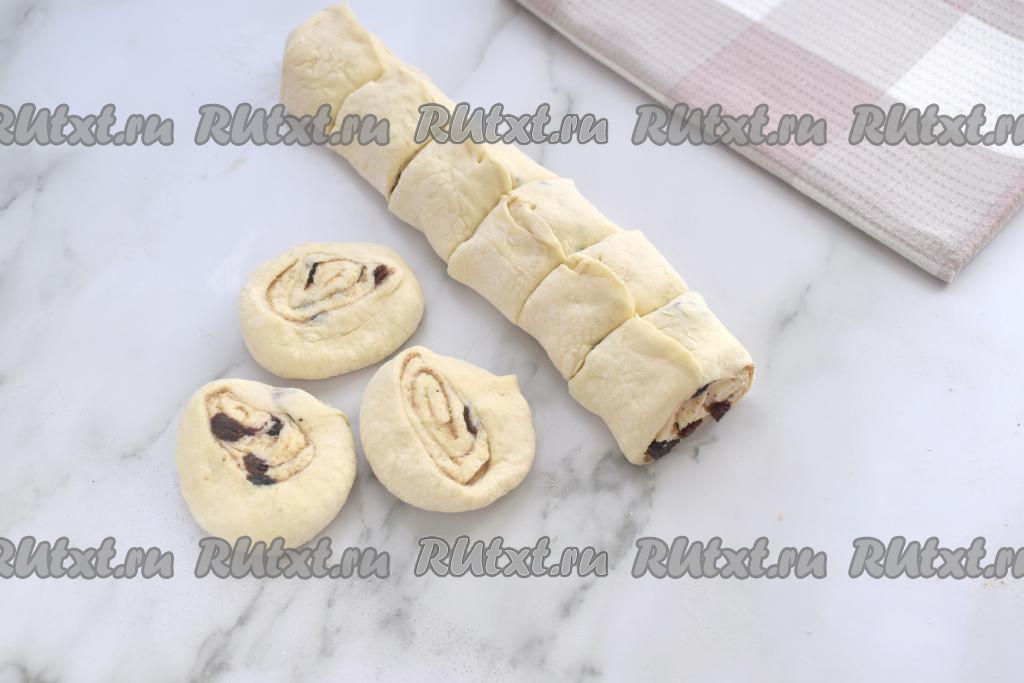Конец рулета закрепляем. Нарезаем получившийся рулет из слоёного теста с изюмом на кусочки шириной примерно 3,5 сантиметров. У меня получились 9 кусочков. Кусочки теста ставим на срезы и сверху прижимаем слегка ладонью.