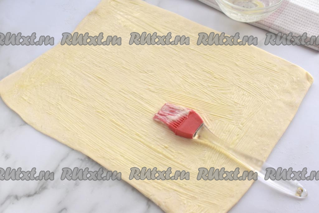 Сливочное масло растапливаем (я растопила сливочное масло в микроволновке в течение 15 секунд), даём ему остыть. Стол присыпаем мукой, выкладываем на него размороженный пласт слоёного теста и раскатываем его в прямоугольник размером ориентировочно 30 сантиметров на 22 сантиметров. Раскатанное тесто с помощью силиконовой кисточки смазываем растопленным сливочным маслом.