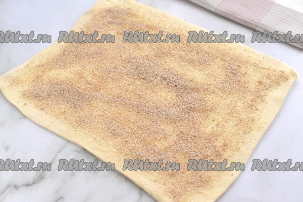 В небольшой ёмкости смешиваем сахар и корицу до однородности. Получившейся смесью из сахара и корицы посыпаем слоёное тесто, отступая от краёв примерно по 1 сантиметру.