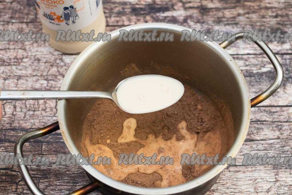 Затем к смеси какао и сахара влить 3 столовых ложки молока.