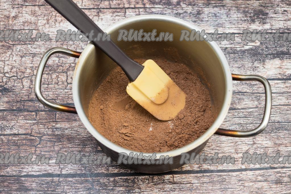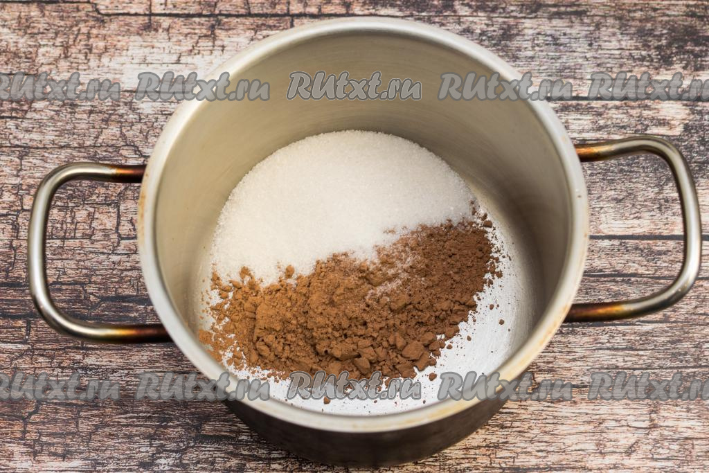 В небольшую по размеру кастрюльку с толстым дном отмерить какао и сахар.