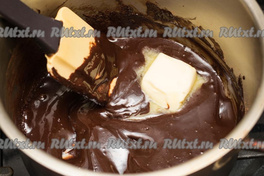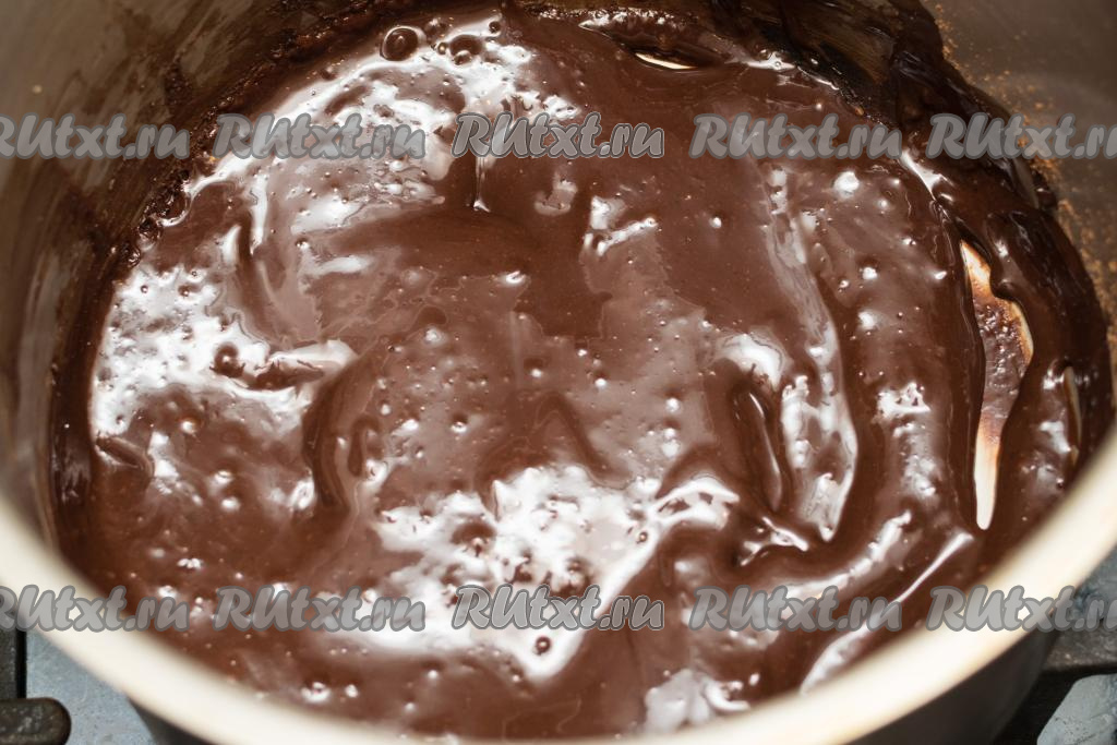 Готовая шоколадная помадка получается достаточно тягучей, глянцевой. Снять её с огня.