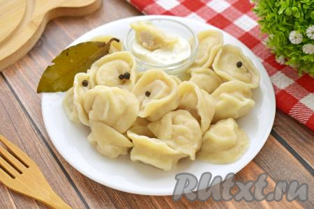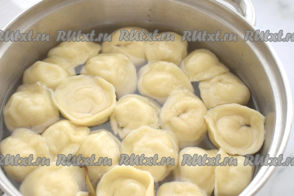 Часть пельменей можно выложить в один слой на доску, припылённую мукой, и отправить до полного замораживания в морозилку. Замороженные пельмени нужно будет переложить в пакет и отправить в морозилку, а затем отварить по мере необходимости. Часть свежеслепленных пельменей можно отварить, выложив их в кастрюлю с достаточно большим количеством кипящей подсоленной воды, я ещё добавляю в воду лавровый лист. Ещё раз довести воду до кипения, уменьшить огонь и варить пельмени с момента всплытия 5 минут.