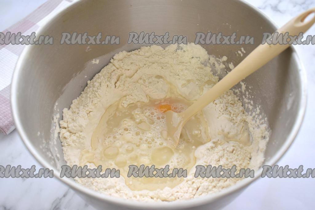 В центр мучной смеси вливаем тёплую воду, растительное масло и вбиваем туда же куриное яйцо.