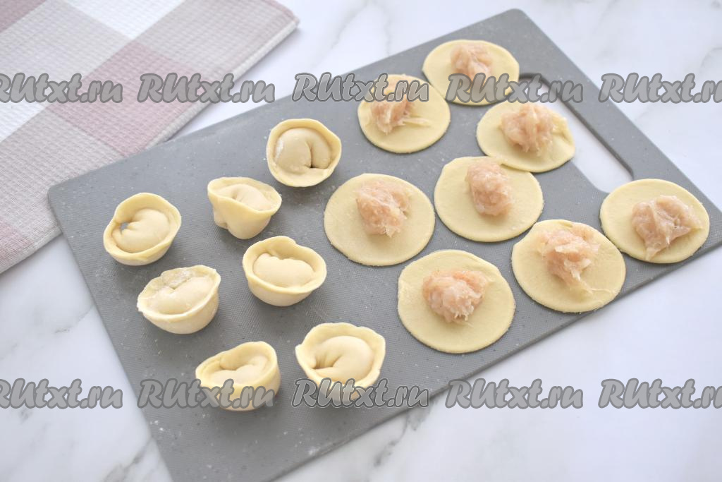 В центр каждого кружка из теста выкладываем по 0,5 чайной ложки куриной начинки. Плотно скрепляем противоположные края кружка над начинкой, формируя пельмень в виде полумесяца, а затем скрепляем концы полумесяца, формируя пельмень, как на фото. Постепенно лепим все пельмени. Тесто, оставшееся после вырезания кружков, снова собираем, раскатываем и тоже лепим из него пельмени. Из предложенного количества ингредиентов я слепила около 100 пельменей.