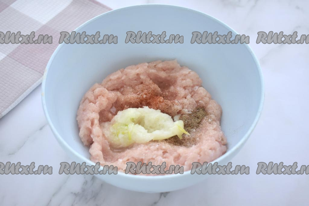 Пока пельменное тесто охлаждается, займёмся начинкой. Для этого в миску с куриным фаршем добавляем лук, натёртый на крупной тёрке (или пропущенный через мясорубку), солим, приправляем специями (в качестве специй я решила использовать паприку и чёрный молотый перец). Тщательно перемешиваем фарш и начинка для пельменей готова.