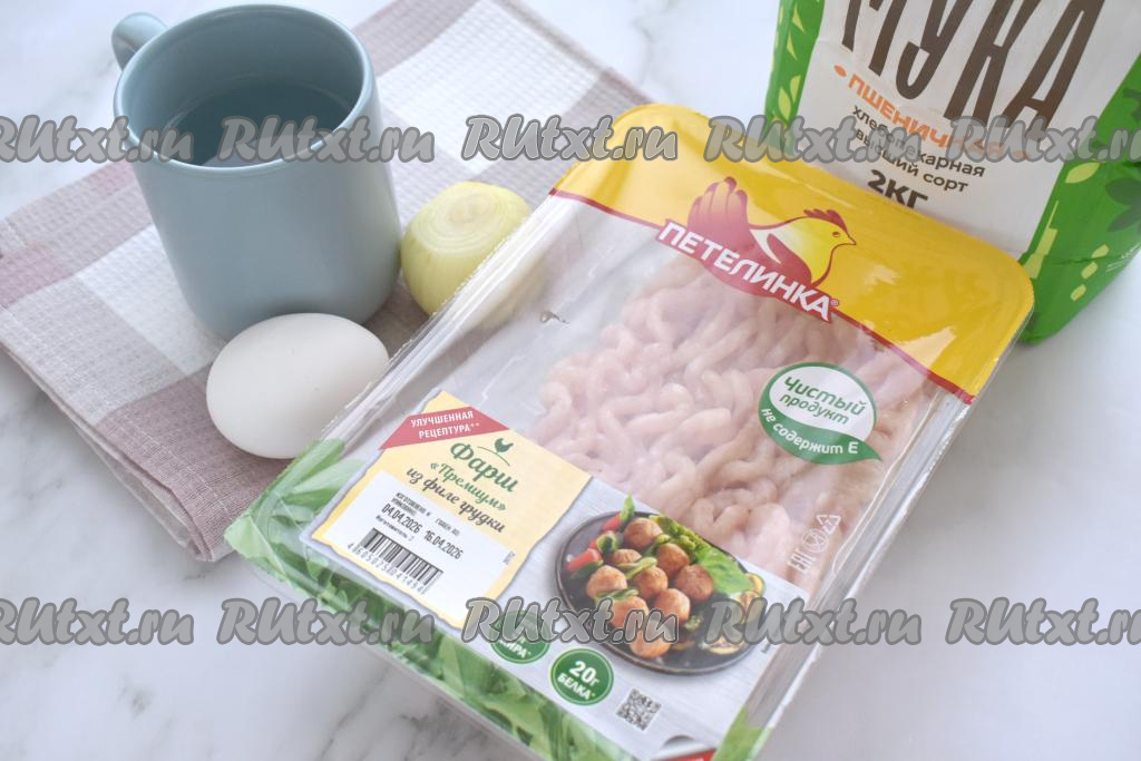 Подготовим продукты. Куриный фарш я использовала покупной, но можно приготовить фарш и в домашних условиях, прокрутив кусочки мяса курицы через мясорубку. Вода для замешивания пельменного теста должна быть слегка тёплой. Лук очищаем.