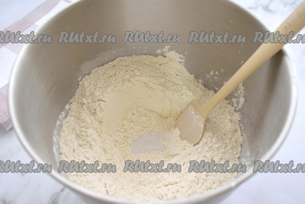 Прежде всего замесим пельменное тесто, для этого в глубокую миску просеиваем 400 грамм муки, всыпаем соль. Перемешиваем муку с солью, образуя в центре небольшое углубление.