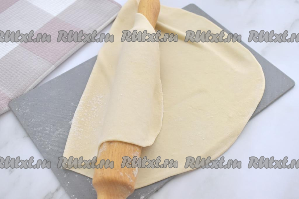"Охладившееся" пельменное тесто достаём из холодильника, делим на 4 части. Пока работаем с одной частью теста, оставшееся тесто, чтобы оно не заветривалось, накрываем плёнкой. Вначале одну часть теста на присыпанной мукой поверхности раскатываем в пласт толщиной около 2 миллиметров.